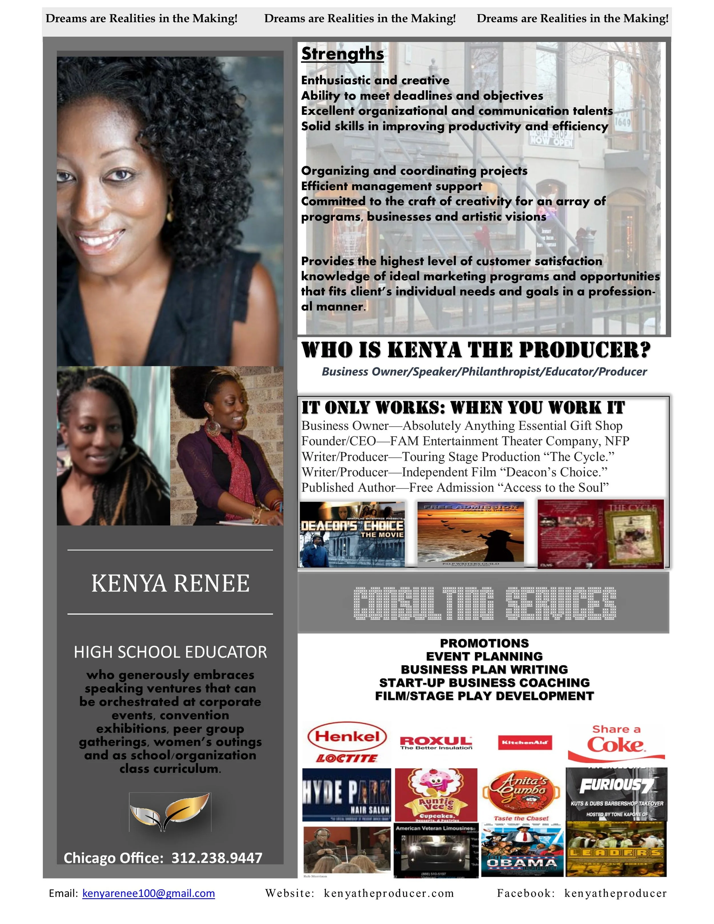 Kenya’s key focus is the breaking of the many cycles in our lives. She enjoys consulting and embraces ventures that can be orchestrated through traditional and non-traditional avenues for individuals, artists, business owners, executives, convention exhibitors, tour managers, product brands, fundraising ideas, group outings and sponsored events.